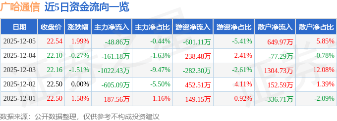 证券之星消息,截至2025年12月5日收盘,广哈通信(300711)报收于22.54元,上涨1.99%,换手率2.0%,成交量4.96万手,成交额1.11亿元。