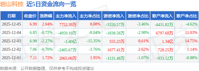 证券之星消息,截至2025年12月5日收盘,岩山科技(002195)报收于6.99元,上涨2.04%,换手率2.46%,成交量137.96万手,成交额9.59亿元。