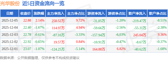 12月5日的资金流向数据方面,主力资金净流入250.52万元,占总成交额9.72%,游资资金净流出31.05万元,占总成交额1.2%,散户资金净流出219.47万元,占总成交额8.51%。