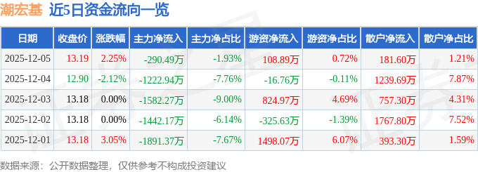 12月5日的资金流向数据方面,主力资金净流出290.49万元,占总成交额1.93%,游资资金净流入108.89万元,占总成交额0.72%,散户资金净流入181.6万元,占总成交额1.21%。