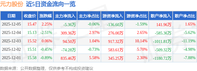 证券之星消息,截至2025年12月5日收盘,元力股份(300174)报收于15.47元,上涨2.25%,换手率1.55%,成交量5.62万手,成交额8611.67万元。