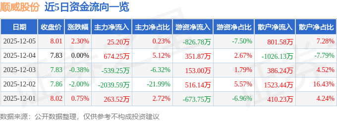 证券之星消息,截至2025年12月5日收盘,顺威股份(002676)报收于8.01元,上涨2.3%,换手率1.93%,成交量13.88万手,成交额1.1亿元。
