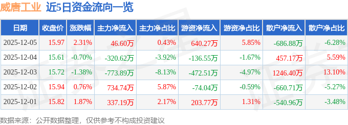 证券之星消息,截至2025年12月5日收盘,威唐工业(300707)报收于15.97元,上涨2.31%,换手率4.8%,成交量6.88万手,成交额1.09亿元。