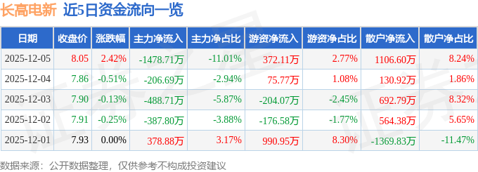 证券之星消息,截至2025年12月5日收盘,长高电新(002452)报收于8.05元,上涨2.42%,换手率3.27%,成交量16.85万手,成交额1.34亿元。