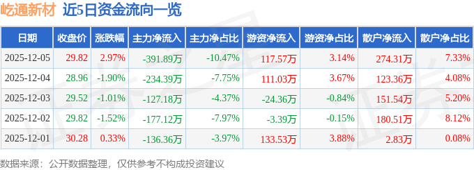 12月5日的资金流向数据方面,主力资金净流出391.89万元,占总成交额10.47%,游资资金净流入117.57万元,占总成交额3.14%,散户资金净流入274.31万元,占总成交额7.33%。