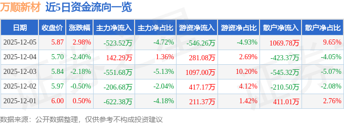 证券之星消息,截至2025年12月5日收盘,万顺新材(300057)报收于5.87元,上涨2.98%,换手率2.63%,成交量19.05万手,成交额1.11亿元。