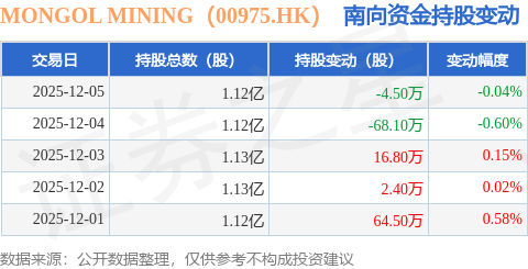 证券之星消息,12月5日南向资金减持4.5万股MONGOL MINING(00975.HK)。近5个交易日中,获南向资金增持的有3天,累计净增持11.1万股。近20个交易日中,获南向资金减持的有13天,累计净减持230.4万股。截至目前,南向资金持有MONGOL MINING(00975.HK)1.12亿股,占公司已发行普通股的10.74%。