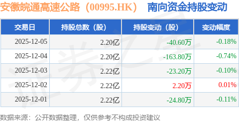 证券之星消息,12月5日南向资金减持40.6万股安徽皖通高速公路(00995.HK)。近5个交易日中,获南向资金减持的有4天,累计净减持250.2万股。近20个交易日中,获南向资金减持的有9天,累计净减持432.43万股。截至目前,南向资金持有安徽皖通高速公路(00995.HK)2.2亿股,占公司已发行普通股的40.43%。