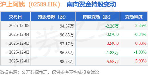 证券之星消息,12月5日南向资金减持2.28万股沪上阿姨(02589.HK)。近5个交易日中,获南向资金增持的有2天,累计净增持1.43万股。近20个交易日中,获南向资金增持的有11天,累计净增持14.71万股。截至目前,南向资金持有沪上阿姨(02589.HK)94.57万股,占公司已发行普通股的1.59%。