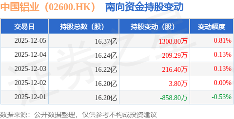 证券之星消息,12月5日南向资金增持1308.8万股中国铝业(02600.HK)。近5个交易日中,获南向资金增持的有4天,累计净增持879.49万股。近20个交易日中,获南向资金减持的有10天,累计净减持5832.51万股。截至目前,南向资金持有中国铝业(02600.HK)16.37亿股,占公司已发行普通股的41.5%。