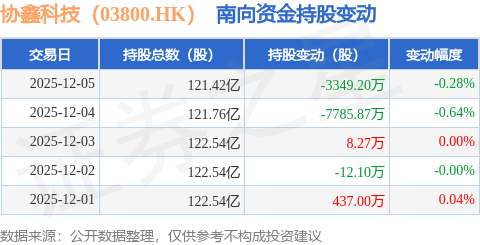 证券之星消息,12月5日南向资金减持3349.2万股协鑫科技(03800.HK)。近5个交易日中,获南向资金减持的有3天,累计净减持1.07亿股。近20个交易日中,获南向资金增持的有10天,累计净增持1.22亿股。截至目前,南向资金持有协鑫科技(03800.HK)121.42亿股,占公司已发行普通股的36.54%。
