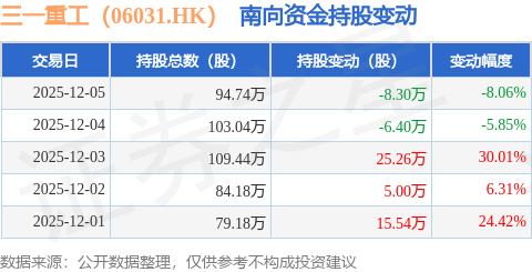 证券之星消息,12月5日南向资金减持8.3万股三一重工(06031.HK)。近5个交易日中,获南向资金增持的有3天,累计净增持31.1万股。截至目前,南向资金持有三一重工(06031.HK)94.74万股,占公司已发行普通股的0.12%。