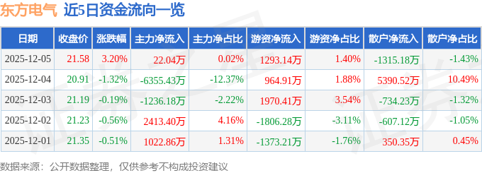 证券之星消息,截至2025年12月5日收盘,东方电气(600875)报收于21.58元,上涨3.2%,换手率1.91%,成交量43.13万手,成交额9.23亿元。