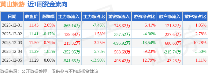 资金流向数据方面,本周黄山旅游主力资金合计净流出1414.53万元,游资资金合计净流入556.99万元,散户资金合计净流入857.54万元。本周资金流向一览见下表:
