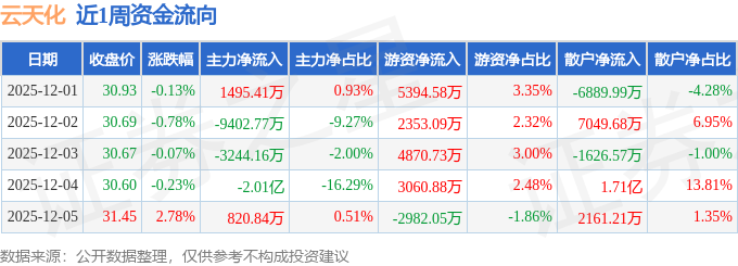 资金流向数据方面,本周云天化主力资金合计净流出3.04亿元,游资资金合计净流入1.27亿元,散户资金合计净流入1.77亿元。本周资金流向一览见下表: