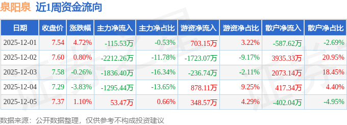 资金流向数据方面,本周泉阳泉主力资金合计净流出5406.16万元,游资资金合计净流出29.98万元,散户资金合计净流入5436.14万元。本周资金流向一览见下表: