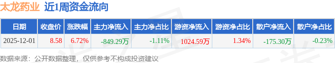 资金流向数据方面,本周太龙药业主力资金合计净流出849.29万元,游资资金合计净流入1024.59万元,散户资金合计净流出175.3万元。本周资金流向一览见下表: