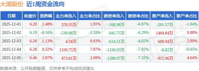 资金流向数据方面,本周大湖股份主力资金合计净流入1648.8万元,游资资金合计净流出4349.14万元,散户资金合计净流入2700.34万元。本周资金流向一览见下表: