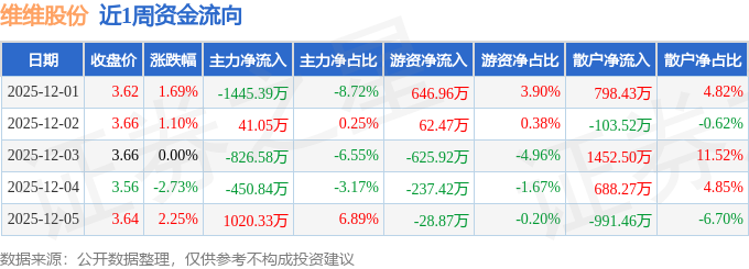 资金流向数据方面,本周维维股份主力资金合计净流出1661.44万元,游资资金合计净流出182.78万元,散户资金合计净流入1844.22万元。本周资金流向一览见下表: