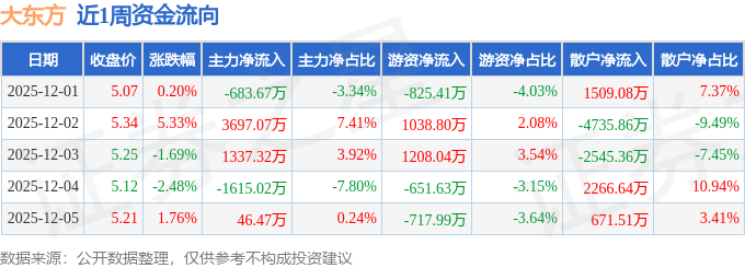 资金流向数据方面,本周大东方主力资金合计净流入2782.18万元,游资资金合计净流入51.81万元,散户资金合计净流出2833.98万元。本周资金流向一览见下表: