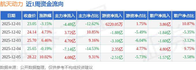 资金流向数据方面,本周航天动力主力资金合计净流入8779.08万元,游资资金合计净流出4.53亿元,散户资金合计净流入3.65亿元。本周资金流向一览见下表: