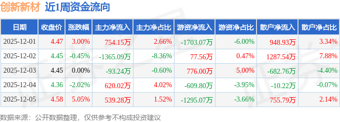 资金流向数据方面,本周创新新材主力资金合计净流入455.12万元,游资资金合计净流出2754.39万元,散户资金合计净流入2299.27万元。本周资金流向一览见下表: