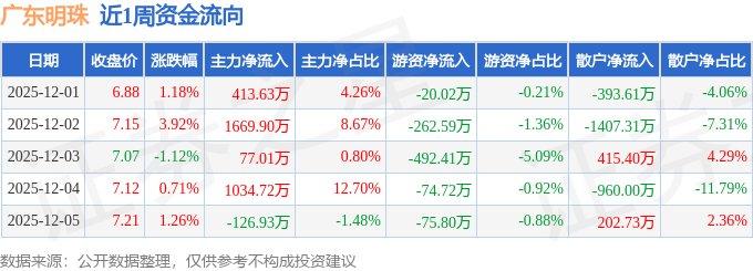 资金流向数据方面,本周广东明珠主力资金合计净流入3068.34万元,游资资金合计净流出925.54万元,散户资金合计净流出2142.8万元。本周资金流向一览见下表: