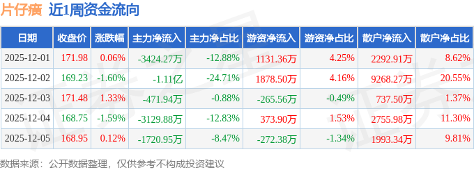 证券之星消息,截至2025年12月5日收盘,片仔癀(600436)报收于168.95元,较上周的171.87元下跌1.7%。本周,片仔癀12月1日盘中最高价报172.17元。12月3日盘中最低价报166.82元,股价触及近一年最低点。片仔癀当前最新总市值1019.3亿元,在中药板块市值排名1/67,在两市A股市值排名170/5169。