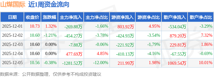 沪深股通持股方面,截止2025年12月5日收盘,山煤国际沪股通持股数为3418.96万股,占流通股比为172.0%。