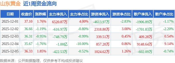 资金流向数据方面,本周山东黄金主力资金合计净流出5273.26万元,游资资金合计净流出73.83万元,散户资金合计净流入5347.1万元。本周资金流向一览见下表:
