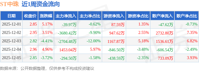 资金流向数据方面,本周ST中珠主力资金合计净流出5266.34万元,游资资金合计净流入918.0万元,散户资金合计净流入4348.34万元。本周资金流向一览见下表: