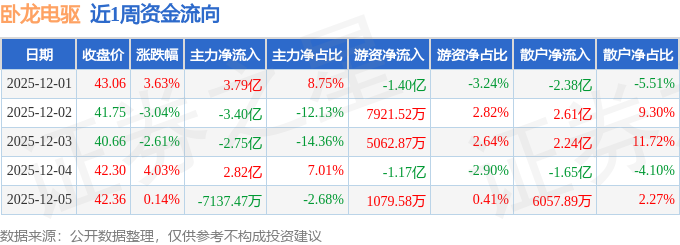 资金流向数据方面,本周卧龙电驱主力资金合计净流出2617.08万元,游资资金合计净流出1.16亿元,散户资金合计净流入1.43亿元。本周资金流向一览见下表: