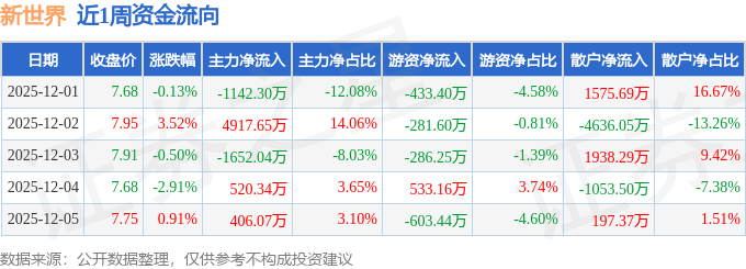 资金流向数据方面,本周新世界主力资金合计净流入3049.71万元,游资资金合计净流出1071.53万元,散户资金合计净流出1978.19万元。本周资金流向一览见下表: