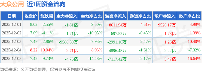 资金流向数据方面,本周大众公用主力资金合计净流出6.53亿元,游资资金合计净流出7090.59万元,散户资金合计净流入7.24亿元。本周资金流向一览见下表: