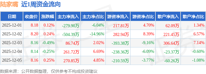 资金流向数据方面,本周陆家嘴主力资金合计净流出164.98万元,游资资金合计净流出341.58万元,散户资金合计净流入506.56万元。本周资金流向一览见下表: