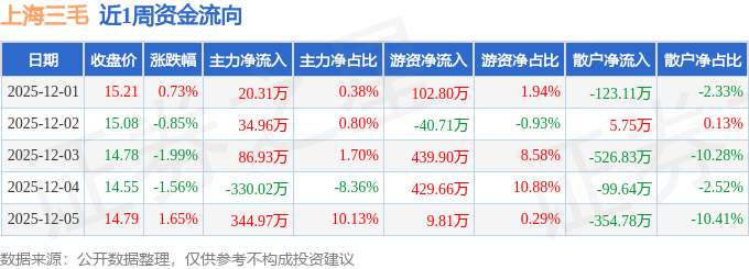 资金流向数据方面,本周上海三毛主力资金合计净流入157.14万元,游资资金合计净流入941.46万元,散户资金合计净流出1098.6万元。本周资金流向一览见下表:
