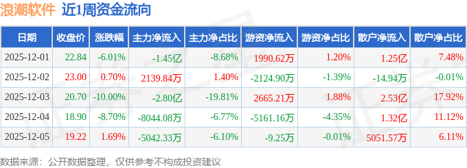 资金流向数据方面,本周浪潮软件主力资金合计净流出5.34亿元,游资资金合计净流出2639.48万元,散户资金合计净流入5.61亿元。本周资金流向一览见下表: