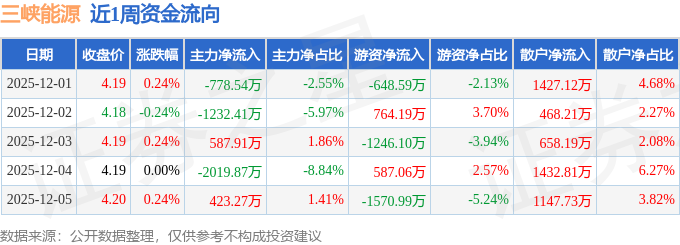 资金流向数据方面,本周三峡能源主力资金合计净流出3019.64万元,游资资金合计净流出2114.43万元,散户资金合计净流入5134.07万元。本周资金流向一览见下表: