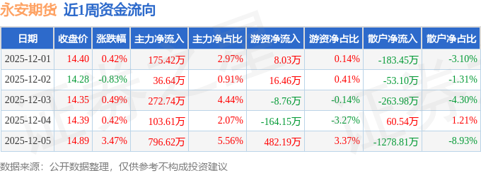 资金流向数据方面,本周永安期货主力资金合计净流入1385.04万元,游资资金合计净流入333.77万元,散户资金合计净流出1718.81万元。本周资金流向一览见下表: