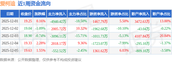 资金流向数据方面,本周爱柯迪主力资金合计净流出4565.15万元,游资资金合计净流出1868.08万元,散户资金合计净流入6433.23万元。本周资金流向一览见下表: