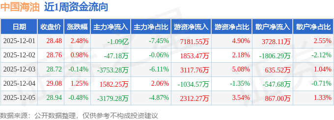 资金流向数据方面,本周中国海油主力资金合计净流出1.63亿元,游资资金合计净流入1.34亿元,散户资金合计净流入2876.67万元。本周资金流向一览见下表: