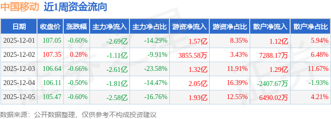 资金流向数据方面,本周中国移动主力资金合计净流出10.81亿元,游资资金合计净流入7.26亿元,散户资金合计净流入3.55亿元。本周资金流向一览见下表: