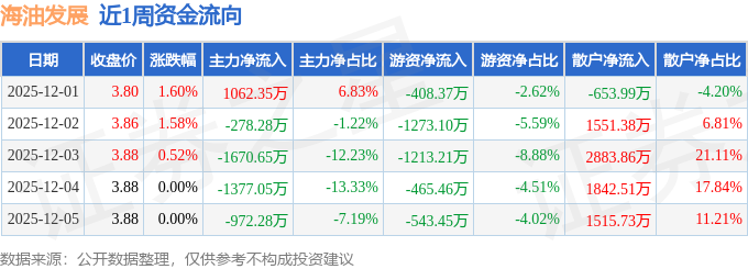 资金流向数据方面,本周海油发展主力资金合计净流出3235.91万元,游资资金合计净流出3903.59万元,散户资金合计净流入7139.5万元。本周资金流向一览见下表: