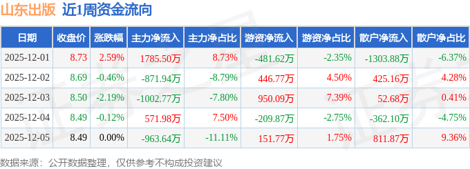 资金流向数据方面,本周山东出版主力资金合计净流出480.87万元,游资资金合计净流入857.14万元,散户资金合计净流出376.27万元。本周资金流向一览见下表: