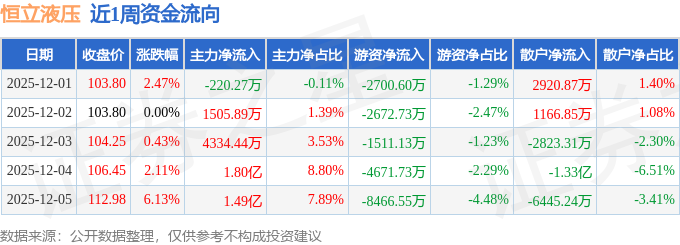 证券之星消息,截至2025年12月5日收盘,恒立液压(601100)报收于112.98元,较上周的101.3元上涨11.53%。本周,恒立液压12月5日盘中最高价报113.47元,股价触及近一年最高点。12月2日盘中最低价报101.0元。恒立液压当前最新总市值1514.86亿元,在工程机械板块市值排名2/28,在两市A股市值排名104/5169。