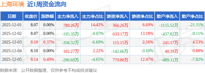 资金流向数据方面,本周上海环境主力资金合计净流入49.17万元,游资资金合计净流入1751.72万元,散户资金合计净流出1800.89万元。本周资金流向一览见下表: