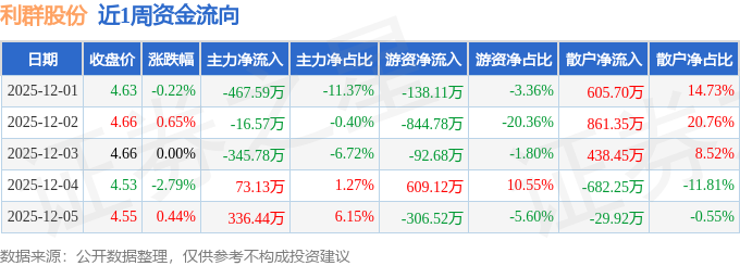 资金流向数据方面,本周利群股份主力资金合计净流出420.37万元,游资资金合计净流出772.96万元,散户资金合计净流入1193.34万元。本周资金流向一览见下表: