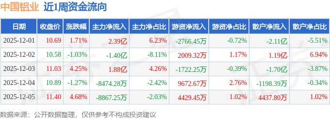 资金流向数据方面,本周中国铝业主力资金合计净流入1.14亿元,游资资金合计净流入1.16亿元,散户资金合计净流出2.3亿元。本周资金流向一览见下表: