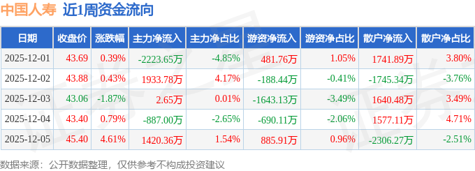 资金流向数据方面,本周中国人寿主力资金合计净流入246.14万元,游资资金合计净流出1154.02万元,散户资金合计净流入907.88万元。本周资金流向一览见下表: