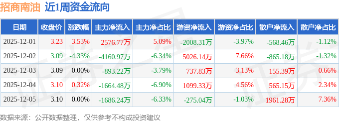 资金流向数据方面,本周招商南油主力资金合计净流出5828.13万元,游资资金合计净流入4579.95万元,散户资金合计净流入1248.18万元。本周资金流向一览见下表: